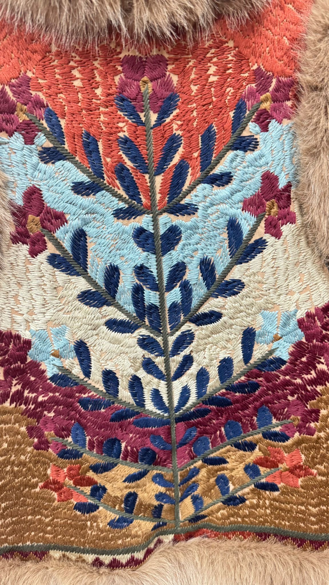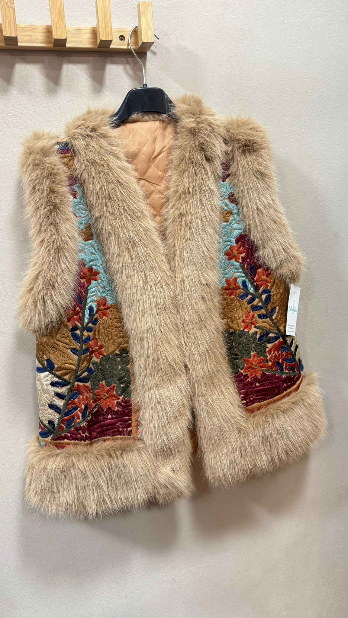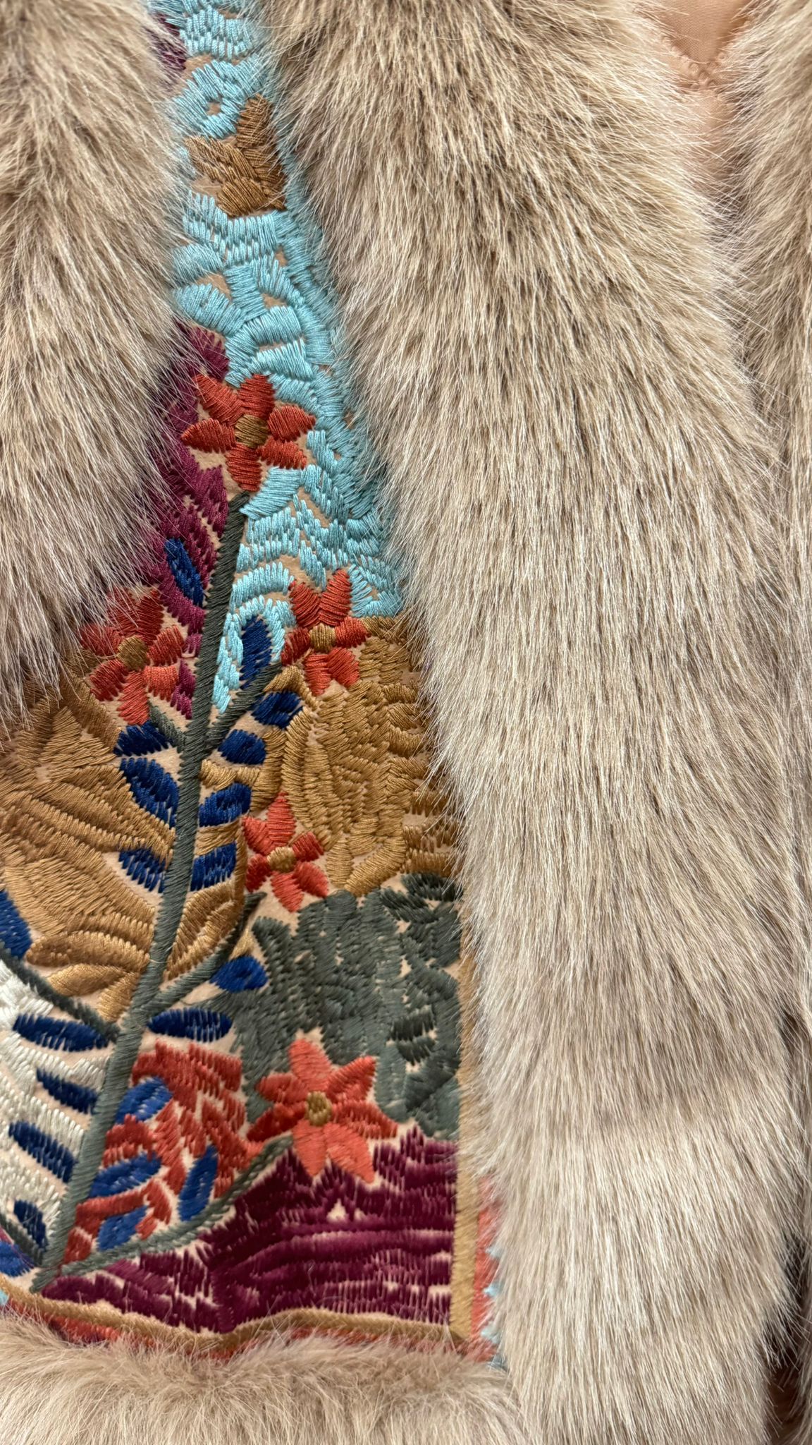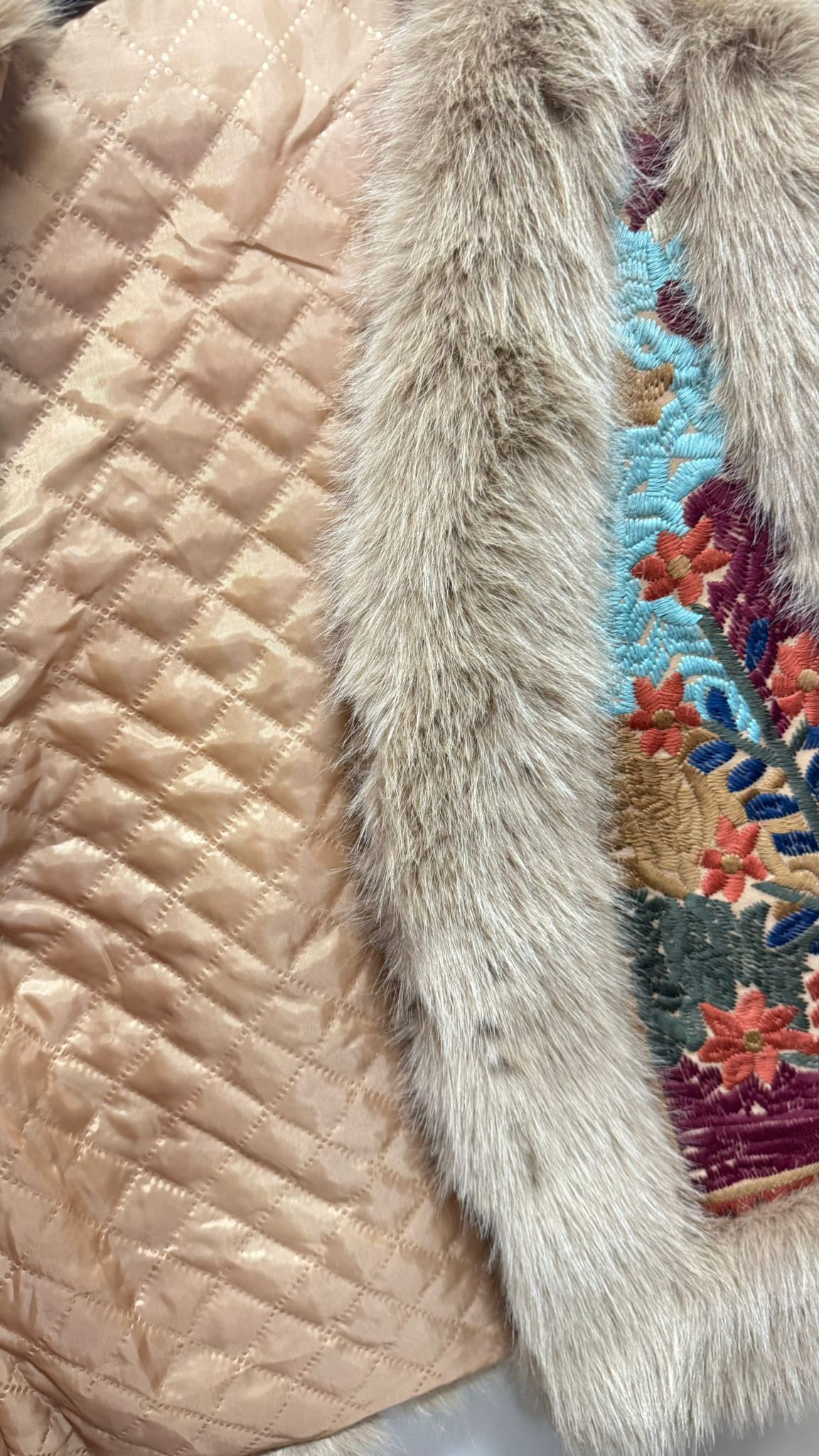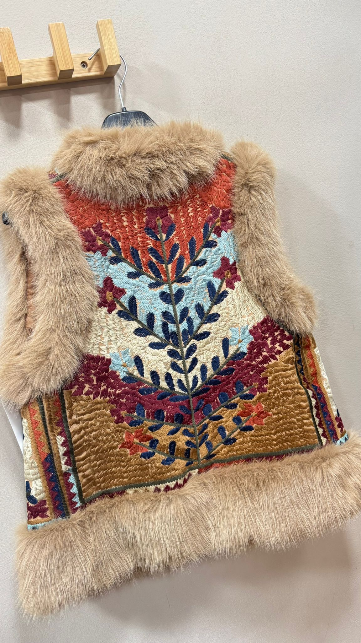 Chaleco forrado interior y bordado. Pelo de Conejo en cuello, bajo y sisas.