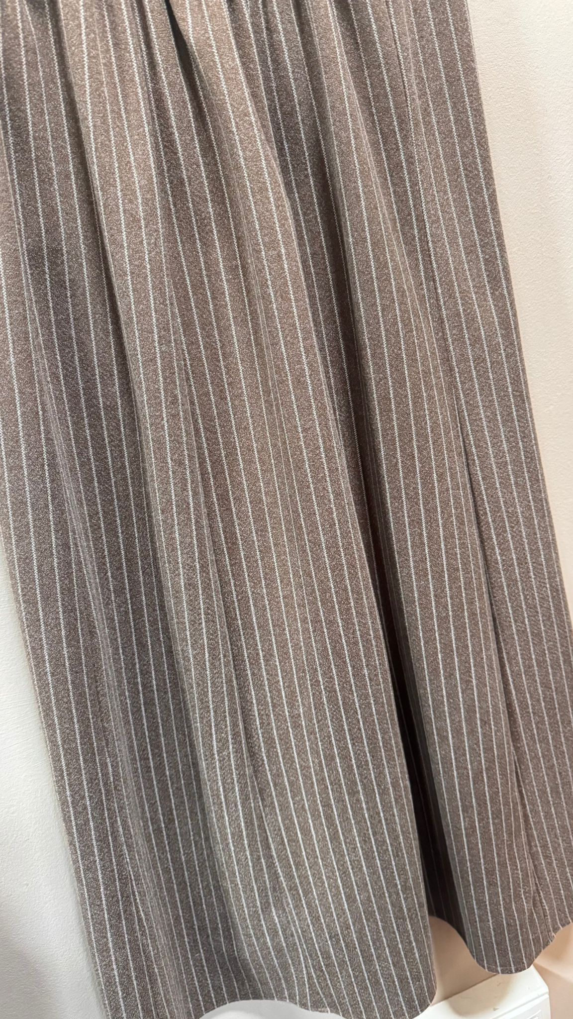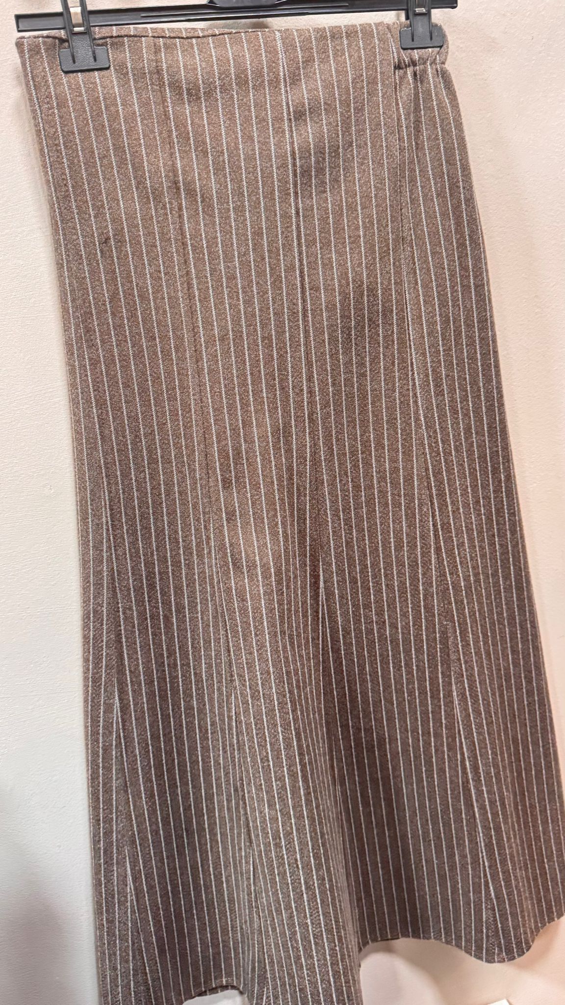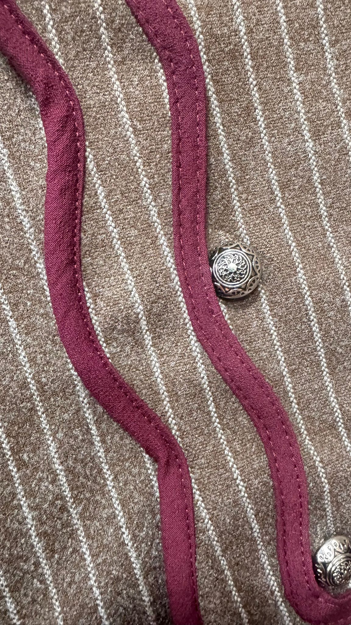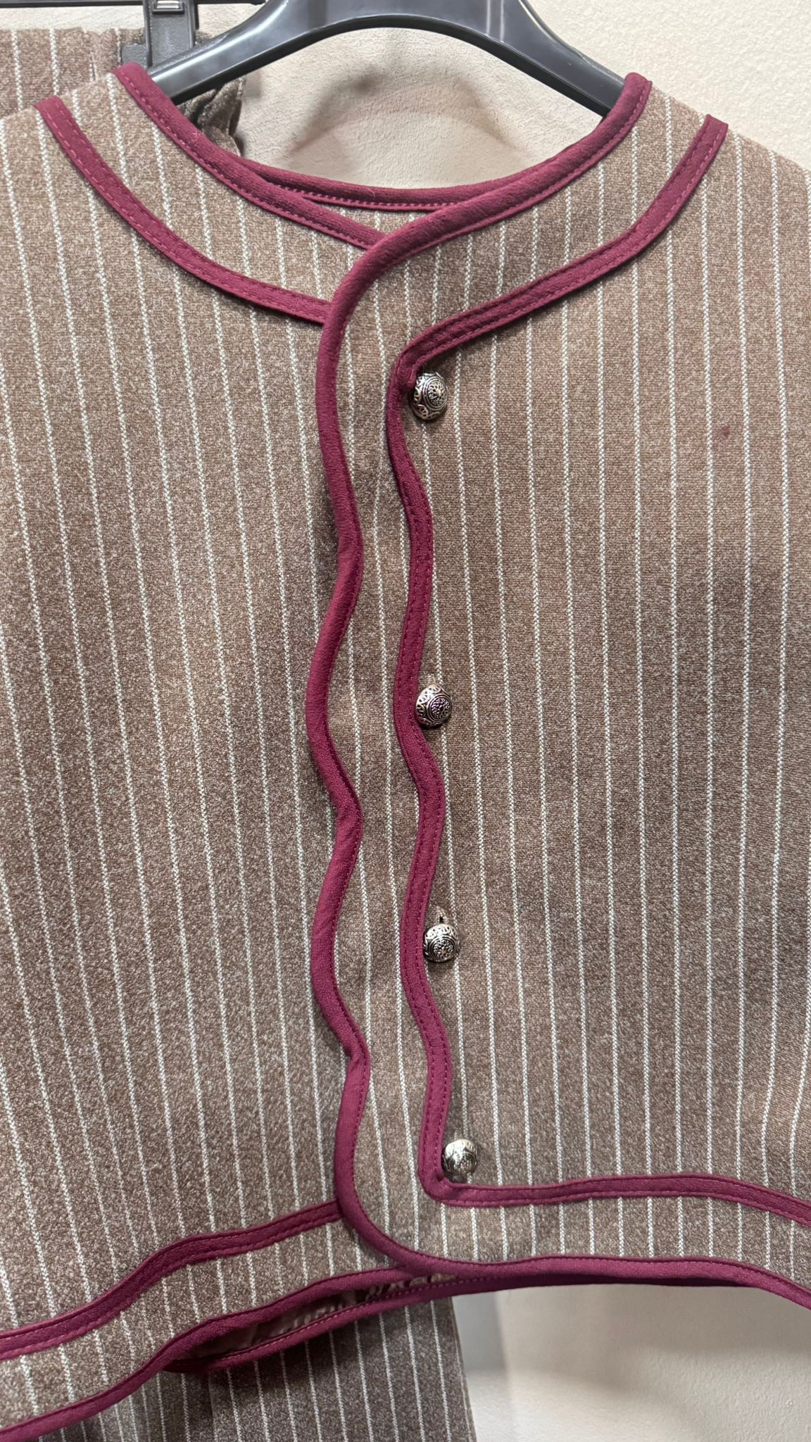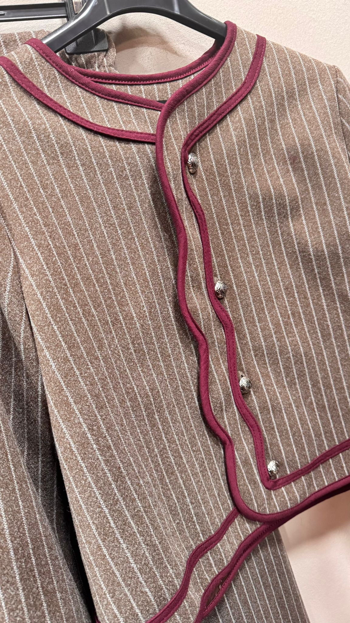 Falda larga con elástico en la parte de la espalda. Chaqueta manga larga cuello caja y botones plateados. La chaqueta va forrada por dentro.